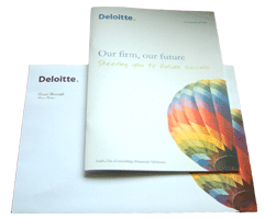Deloitte is an organization of member firms around the world in providing professional services such as audit, tax, consulting, financial edvisory, executed locally in nearly 150 countries. The design and application of visual materials such as corporate catalogues, brochures, web site, advertisement layouts are being developed since 1999.